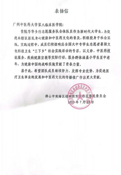 三下鄉(xiāng)結(jié)束后,季華鄉(xiāng)行志愿服務(wù)隊收到了來自桂城街道東區(qū)社區(qū)居委會的表揚信和錦旗。當(dāng)?shù)鼐游璞頁P信和錦旗肯定了季華鄉(xiāng)行志愿服務(wù)隊的暑期“三下鄉(xiāng)”社會實踐活動,贊揚了隊伍隊員的努力付出,并期待季華鄉(xiāng)行隊為鄉(xiāng)村醫(yī)療衛(wèi)生事業(yè)的發(fā)展和中醫(yī)藥文化的傳播作出更大貢獻。