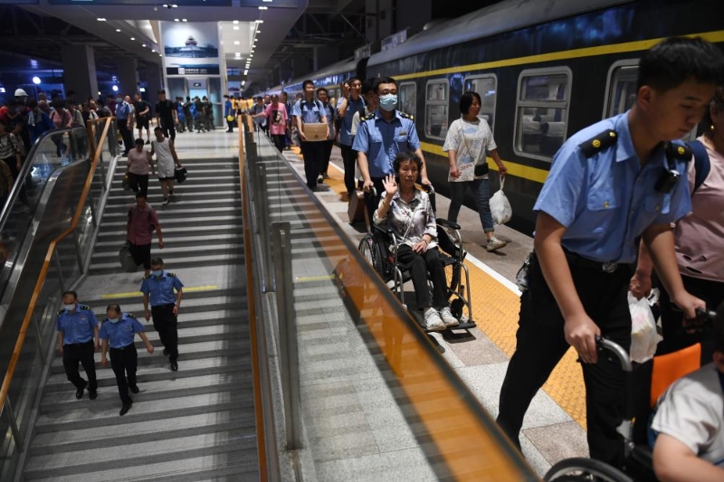 8月3日,K396次、Z180次列車(chē)的滯留旅客到達(dá)北京豐臺(tái)站。新華社記者張晨霖 攝