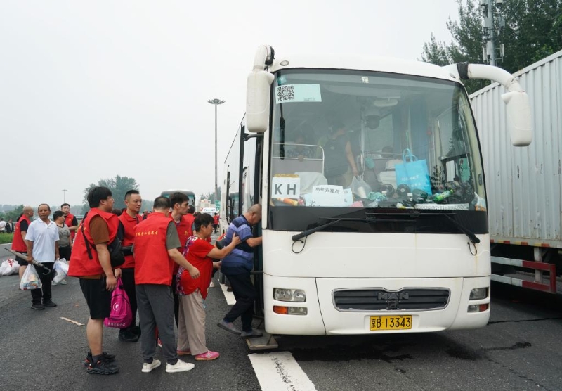 8月2日,在北京市房山區(qū)的京港澳高速琉璃河出口,受災(zāi)群眾有序登上轉(zhuǎn)運(yùn)車(chē)輛。新華社記者任超 攝