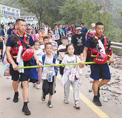 8月2日,北京市消防救援總隊(duì)特勤支隊(duì)和門頭溝支隊(duì)的消防救援隊(duì)伍指戰(zhàn)員護(hù)送旅客轉(zhuǎn)移。北京市消防救援總隊(duì)特勤支隊(duì)供圖(新華社發(fā))