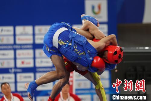 8月3日,第31屆世界大學(xué)生夏季運動會武術(shù)男子60公斤級決賽在四川成都舉行,中國選手馬衣姑(紅)戰(zhàn)勝印度尼西亞選手吉塔拉(GUITARA Bintang reindra nada)奪得金牌?!≈行律缬浾?劉占昆 攝