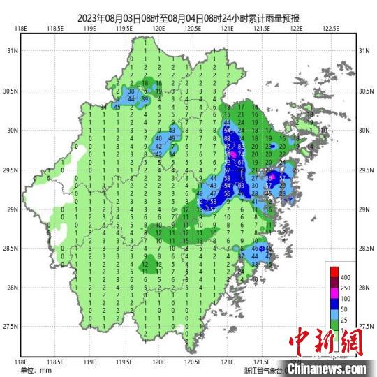 8月3日8時至8月4日8時浙江雨量預(yù)報圖。浙江省氣象臺供圖