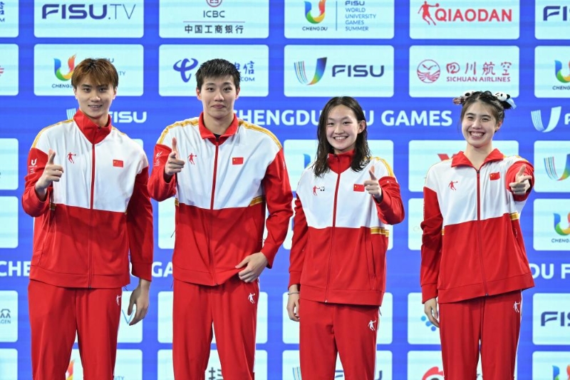 在女子100米蝶泳決賽中,代表東南大學出戰(zhàn)的張雨霏毫無懸念一路領先,最終以56秒57創(chuàng)賽會紀錄的成績奪冠。張雨霏賽后直奔更衣室,參加十余分鐘后展開的男女混合4X100米自由泳接力決賽。中國隊派出陳俊兒、林濤和李冰潔與張雨霏搭檔,并以3分25秒38的成績再添一金,意大利隊和巴西隊分列第二和第三。