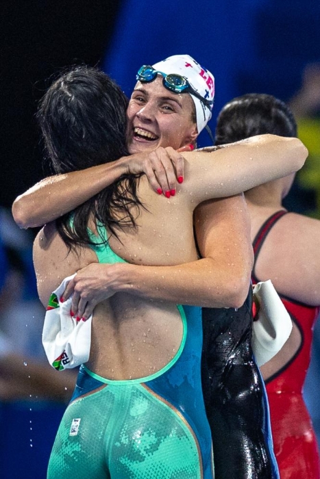 在女子200米蛙泳決賽中,立陶宛選手特特蕾芙科娃以2分22秒86的成績站上最高領獎臺,南非選手科比特奪得銀牌,中國選手朱蕾桔拿到一枚銅牌。賽后,朱蕾桔和特特蕾芙科娃在賽場邊互相擁抱,兩人曾在之前的國際比賽中相識。