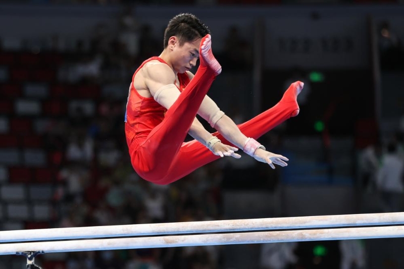 8月5日,鄒敬園在雙杠比賽中。新華社記者張麗蕓攝