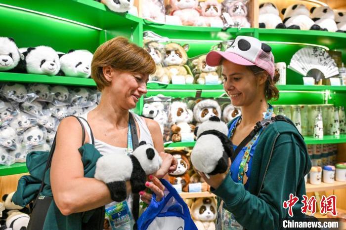 8月1日,成都大運(yùn)會(huì)期間,成都大熊貓繁育研究基地成為參賽代表團(tuán)的熱門打卡點(diǎn),圖為匈牙利選手凡妮(右)選購大熊貓玩偶。中新社記者 趙文宇 攝