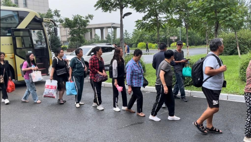 8月4日,轉(zhuǎn)移安置群眾乘大巴來到五常市雅臣中學(xué)。新華社記者劉昊東 攝