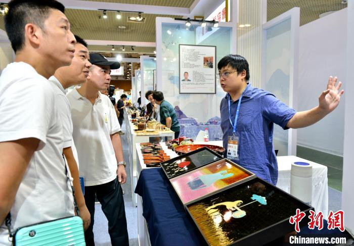 8月5日,第十四屆海峽兩岸(廈門)文化產(chǎn)業(yè)博覽交易會上,臺灣年輕漆藝家鐘尚達(dá)(右)正在介紹自己創(chuàng)作的漆藝作品。中新社記者 呂明 攝