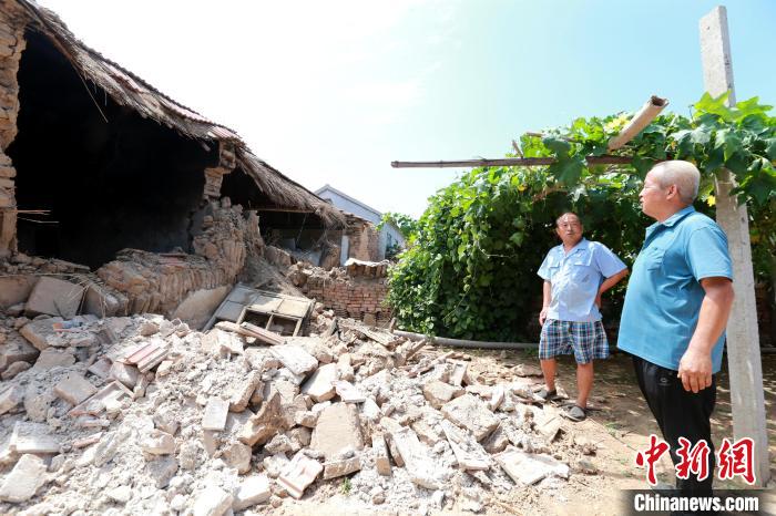 8月6日,山東德州市平原縣震中地區(qū)的村民正在查看一處倒塌的沒有人居住的危房,防止發(fā)生二次傷害。中新社記者 梁犇 攝