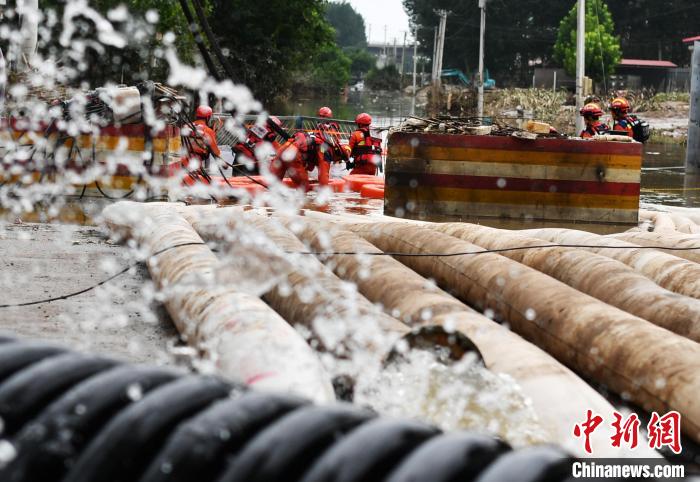 6日,涿州市刁窩鎮(zhèn)東張村村口,唐山市消防救援支隊(duì)正在進(jìn)行排水作業(yè)。中新社記者 翟羽佳 攝
