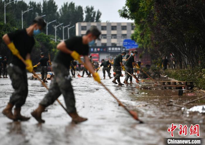 6日,武警河北總隊(duì)官兵在涿州市騰飛大街和朝陽路交口清理路面淤泥和雜物。中新社記者 翟羽佳 攝