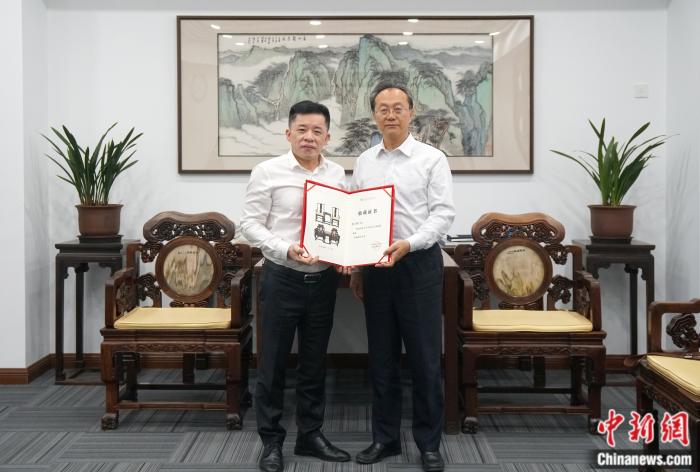 中新網(wǎng)北京8月9日電 日前,知名古典家具藝術(shù)家陳玉樹復(fù)原中國文化遺產(chǎn)研究院館藏故宮家具《靈芝扶手椅》作品收藏活動在京舉行,中國文化遺產(chǎn)研究院黨委書記、院長李六三等出席并為陳玉樹先生頒發(fā)收藏證書。這是中國文化遺產(chǎn)研究院首度收藏古典家具復(fù)原類作品。