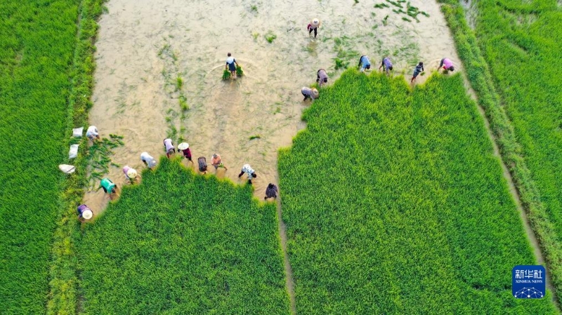 8月8日,在湖南省常寧市板橋鎮(zhèn)樟塘村,農(nóng)民在起晚稻秧苗(無人機照片)。