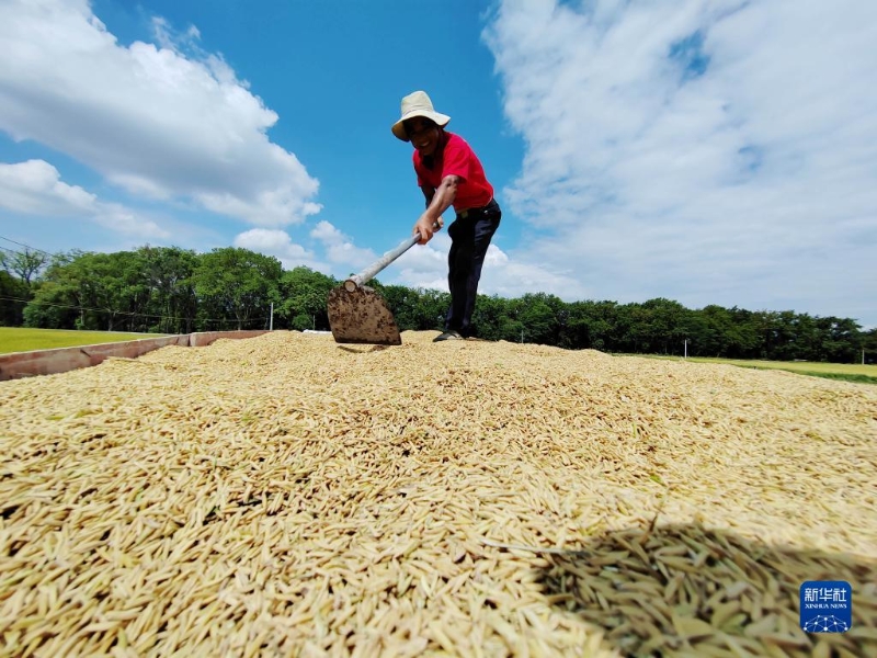 8月8日,在湖南省永州市道縣梅花鎮(zhèn)貴頭村,村民在整理裝車的稻谷(手機照片)。