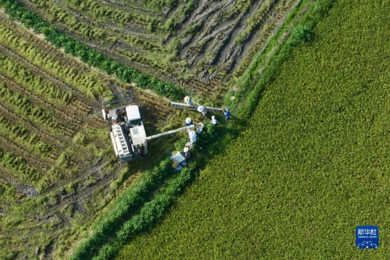 8月8日,收割機在重慶市北碚區(qū)三圣鎮(zhèn)古佛村收割稻谷(無人機照片)。