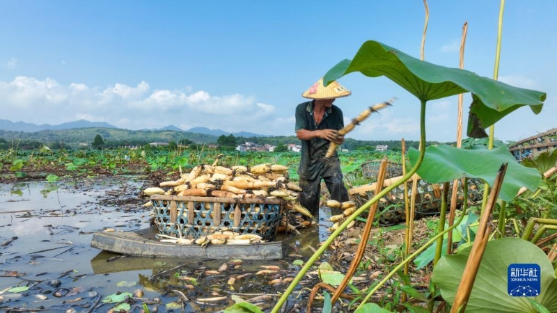 8月8日,浙江省湖州市德清縣康乾街道新琪村村民在荷田中采摘蓮蓬。