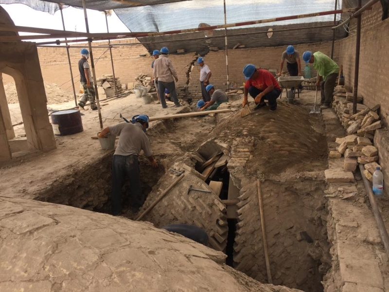 2018年6月21日,在烏茲別克斯坦希瓦古城阿米爾·圖拉經(jīng)學(xué)院,中烏文物修復(fù)人員在經(jīng)學(xué)院東南角穹頂上方進(jìn)行加固施工。新華社發(fā)(中國(guó)文化遺產(chǎn)研究院供圖)