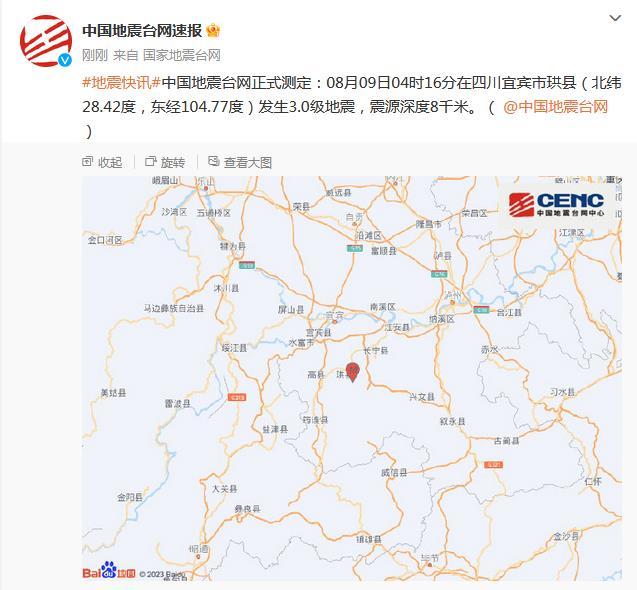 中新網(wǎng)8月9日電 據(jù)國家地震臺網(wǎng)官方微博消息,中國地震臺網(wǎng)正式測定:8月9日04時16分在四川宜賓市珙縣(北緯28.42度,東經(jīng)104.77度)發(fā)生3.0級地震,震源深度8千米。