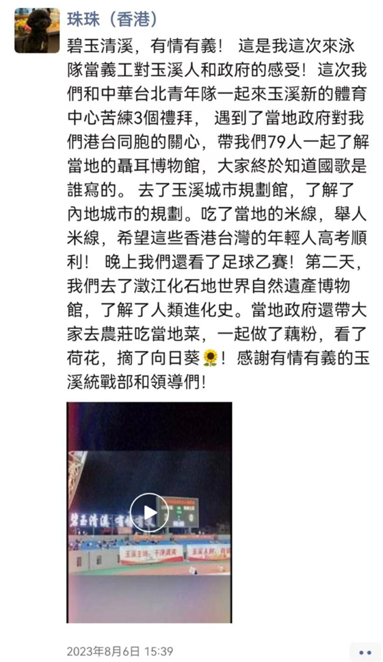 “玉溪非常不錯(cuò),城市很干凈,發(fā)展得也很好?!迸_(tái)灣林教練說(shuō),“玉溪人民很熱情,天氣也很好,這段時(shí)間臺(tái)灣是非常炎熱的,這里就很涼快?!眮?lái)自香港的家長(zhǎng)袁女士也表示:“玉溪是個(gè)有情有義的城市,這是我這次來(lái)泳隊(duì)當(dāng)義工對(duì)玉溪人民和政府的感受,我們感受到了當(dāng)?shù)卣畬?duì)我們港臺(tái)同胞的關(guān)心,感謝玉溪市委統(tǒng)戰(zhàn)部,感謝政府領(lǐng)導(dǎo),感謝玉溪人民!”(來(lái)源:玉溪市委臺(tái)辦)