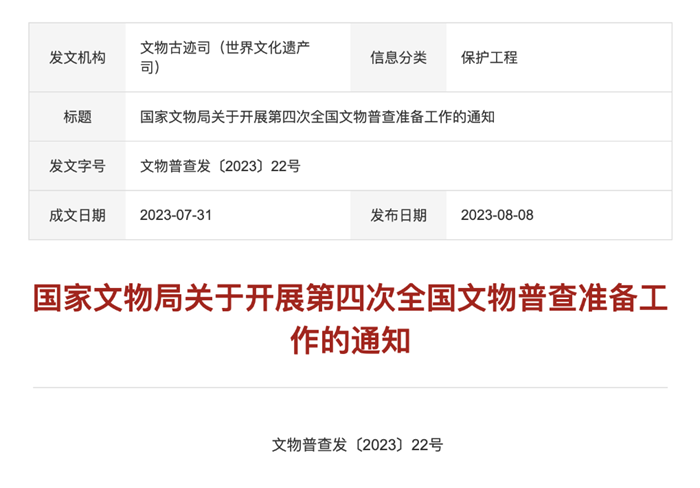 國(guó)家文物局近日發(fā)出通知,就第四次全國(guó)文物普查準(zhǔn)備工作進(jìn)行部署。第四次全國(guó)文物普查是“十四五”期間最大規(guī)模的文物保護(hù)行動(dòng),將以縣域?yàn)榛締卧_(kāi)展實(shí)地調(diào)查。