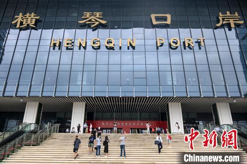 圖為旅客在橫琴口岸新旅檢大樓外拍照?!≈行律缬浾?陳驥旻 攝