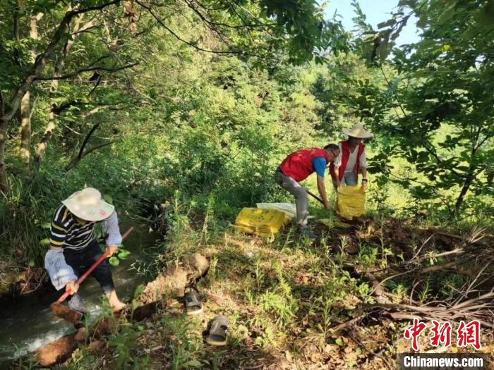 祁陽三口塘鎮(zhèn)由鎮(zhèn)、村黨員干部組成的護水隊正在清渠護水。祁陽市委宣傳部供圖