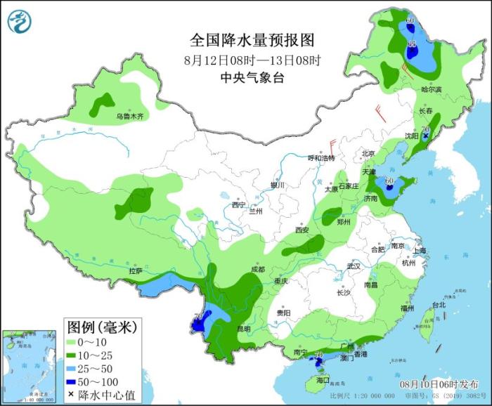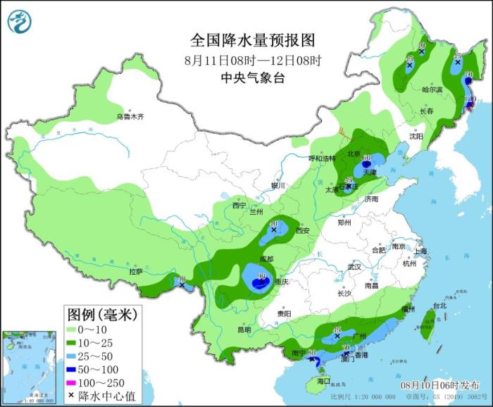 8月11日08時(shí)至12日08時(shí),黑龍江、吉林東北部、北京南部、天津、河北中南部、甘肅東南部、四川盆地南部、福建東南部、廣東、廣西東南部等地部分地區(qū)有大到暴雨,其中,吉林東北部等地局地有大暴雨(100~110毫米)。內(nèi)蒙古中部、東北地區(qū)東部等地部分地區(qū)有4~5級風(fēng);渤海東部海域、黃海東部海域?qū)⒂?~8級、陣風(fēng)9~10級的大風(fēng),其中黃海東部的部分海域風(fēng)力可達(dá)9級、陣風(fēng)10~11級(見圖3)。
