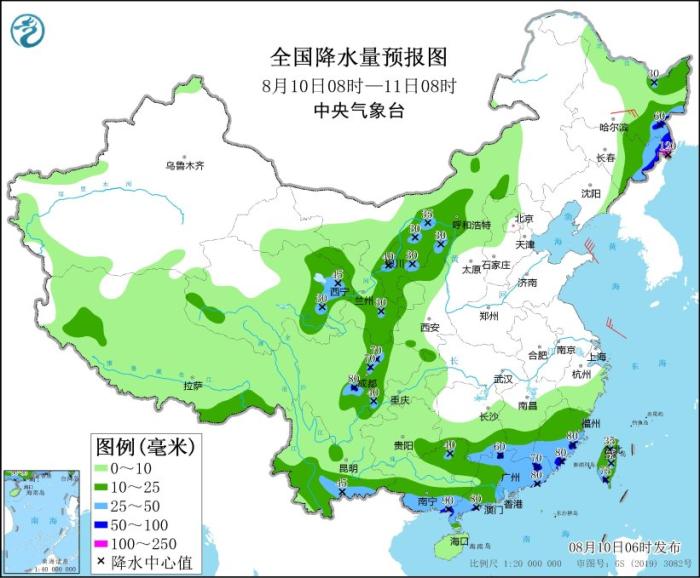 預(yù)計(jì),8月10日08時(shí)至11日08時(shí),黑龍江東部、吉林東部、青海東部、甘肅東部、寧夏、陜西北部、內(nèi)蒙古河套地區(qū)、四川盆地西部和南部、湖南南部、江西南部、福建東部和南部、廣東、廣西南部、云南東南部、臺灣島中南部等地的部分地區(qū)有大到暴雨,其中,吉林東北部等地局部地區(qū)有大暴雨(100~120毫米)(見圖1)。上述部分地區(qū)伴有短時(shí)強(qiáng)降水(最大小時(shí)降雨量20~50毫米,局地可超過60毫米),局地有雷暴大風(fēng)等強(qiáng)對流天氣。中央氣象臺8月10日06時(shí)發(fā)布暴雨藍(lán)色預(yù)警。