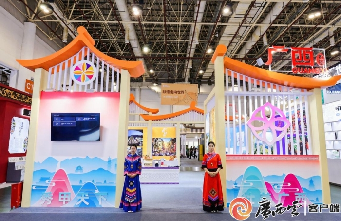據(jù)介紹,廣西展館以“三江風雨橋”為造型靈感,吸取月牙形橋拱、飛揚檐翼、寶塔亭尖等元素,用現(xiàn)代化的設計語言進行二次創(chuàng)作,打造出簡約現(xiàn)代與民族特色兼?zhèn)涞恼桂^造型。整座展館由紅色文化、民族文化、夜游經濟、文博創(chuàng)意四個區(qū)域組成,通過文旅融合的形式,挖掘廣西山水背后的文化內涵,深入淺出地講述廣西文旅故事。