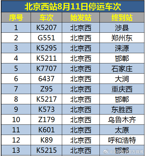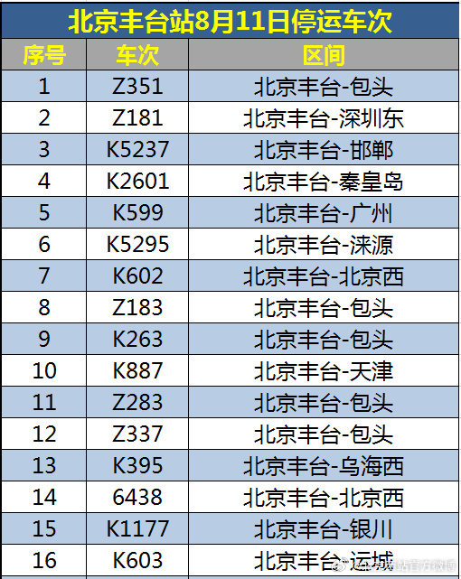 中新網(wǎng)8月11日電 據(jù)北京西站官方微博消息,受水害影響,8月11日北京西站、北京豐臺站部分列車停運,已購買停運列車車票的旅客,可于30日內(nèi)辦理全額退票手續(xù)。請廣大旅客合理安排出行,關(guān)注鐵路部門公告。