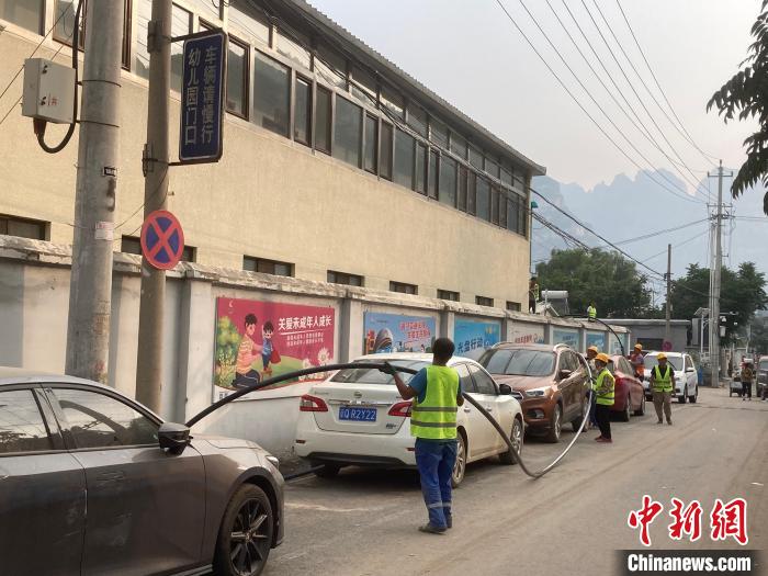 8月9日,北京市房山區(qū)十渡鎮(zhèn)十渡村。工作人員在鋪設(shè)臨時水管?!≈行律缬浾?徐婧 攝
