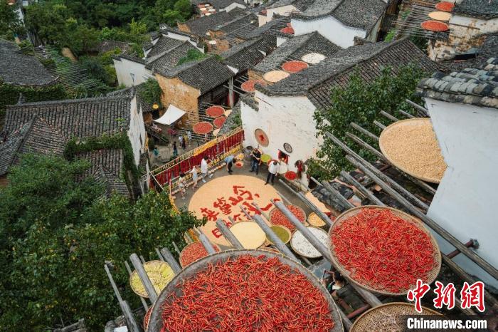 站在婺源篁嶺曬秋觀景平臺處放眼望去,辣椒、玉米、花生、綠豆等農(nóng)作物晾曬于曬架上,色彩鮮明的農(nóng)作物與灰白相間的徽派建筑呈現(xiàn)出一幅好“豐”景。一處平臺上用谷物拼出的巨幅字樣“來篁嶺,曬個(gè)秋”頗為顯眼。