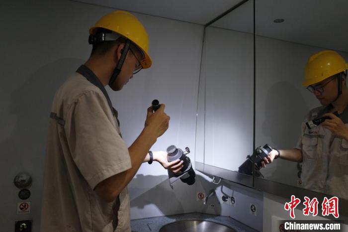 中新網(wǎng)西安8月10日電(崔景靚 張遠(yuǎn))8月的西安,密不透風(fēng)的西安動車段動車組檢修庫泛著層層熱浪,機(jī)械師馮星瑋在動車組衛(wèi)生間對零部件進(jìn)行拆卸檢修。