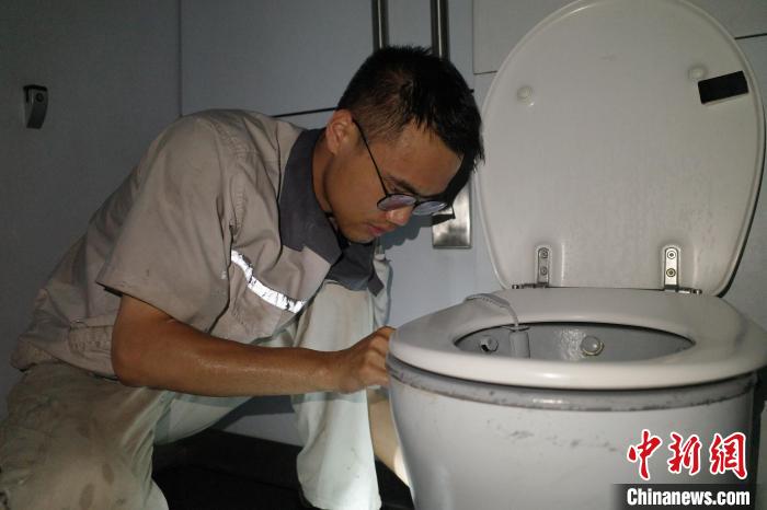 動車組衛(wèi)生間的狀態(tài)直接影響旅客的乘車體驗(yàn)。這里的馬桶不同于家用馬桶,它通過渦輪旋轉(zhuǎn)在泵內(nèi)形成真空把污物吸進(jìn)泵里,再利用負(fù)壓收集到集便箱,既環(huán)保又節(jié)水。然而,若是飲料瓶蓋、尿不濕等雜物被丟入便器,極易導(dǎo)致集污管道堵塞使衛(wèi)生間無法工作。暑運(yùn)期間客流大,馮星瑋的工作量比往日增加了不少。