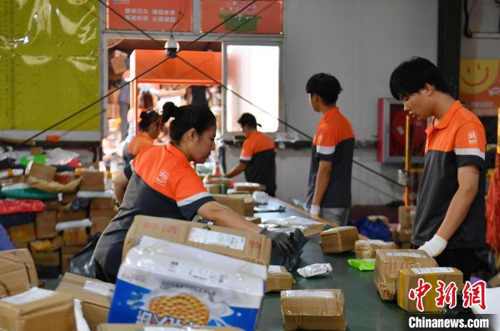 8月9日,在涿州市一家快遞公司,工作人員分揀來(lái)自轉(zhuǎn)運(yùn)中心的快件?!≈行律缬浾?韓冰 攝
