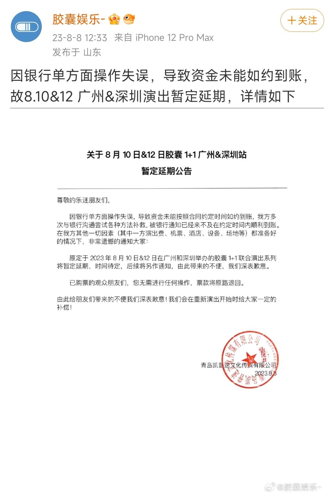 而主辦方“膠囊?jiàn)蕵?lè)”則發(fā)文表示,演出取消的原因?yàn)椤般y行單方面操作失誤”——雖然多次與銀行溝通嘗試各種方法補(bǔ)救,但被銀行通知已經(jīng)來(lái)不及在約定時(shí)間內(nèi)順利到賬。