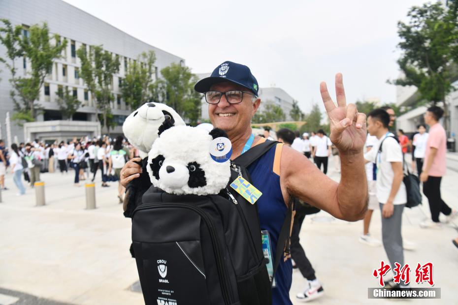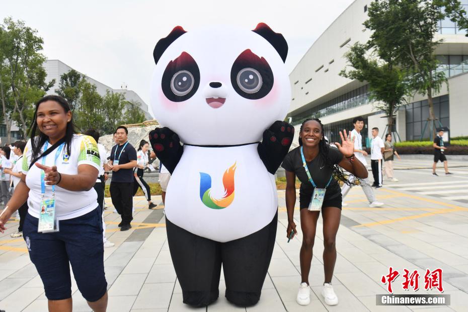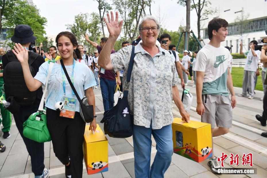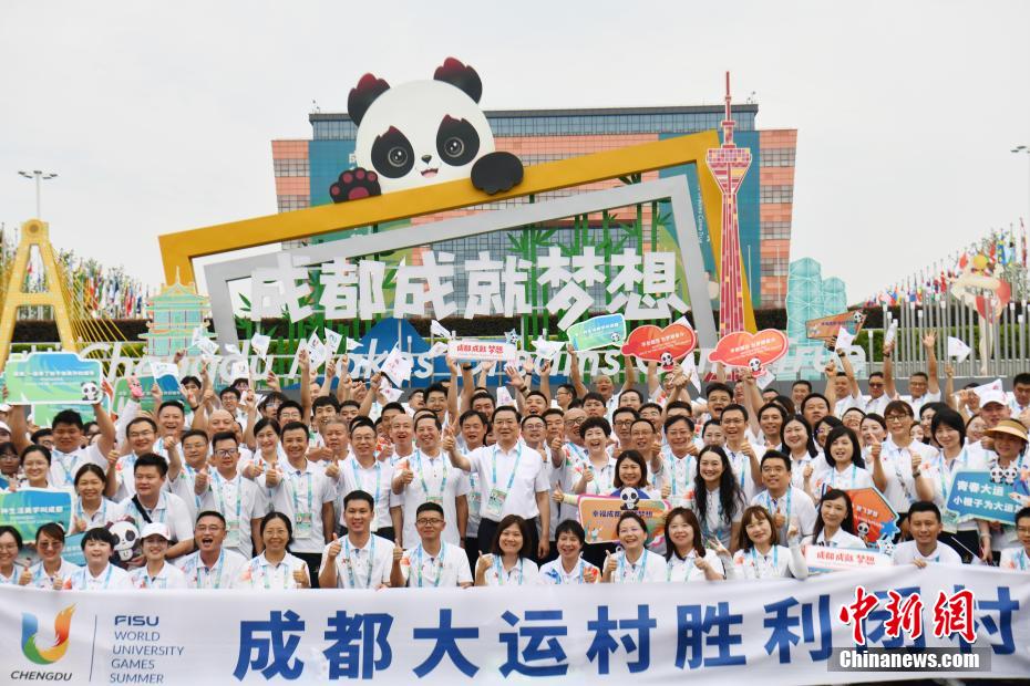 圖為成都大運村最后一批代表團(tuán)成員與“蓉寶”合影。中新網(wǎng)記者 張浪 攝