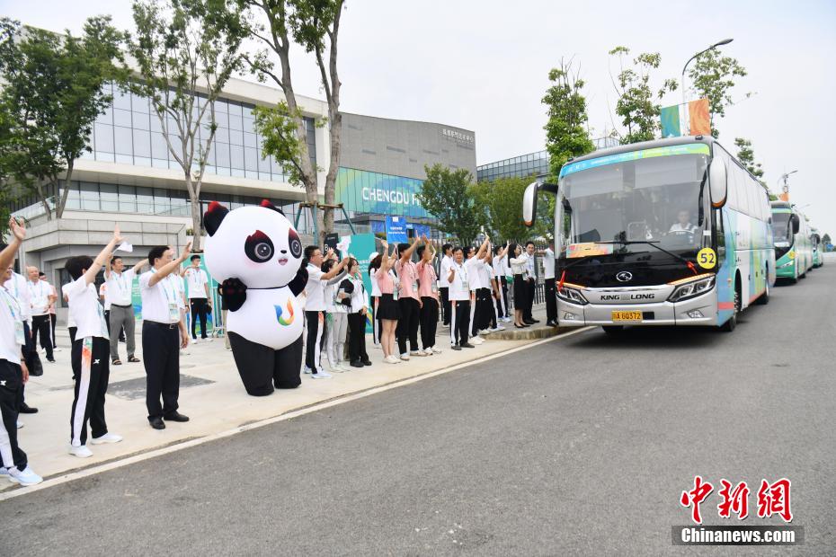 圖為最后一批代表團(tuán)成員乘車離開成都大運村。中新網(wǎng)記者 張浪 攝