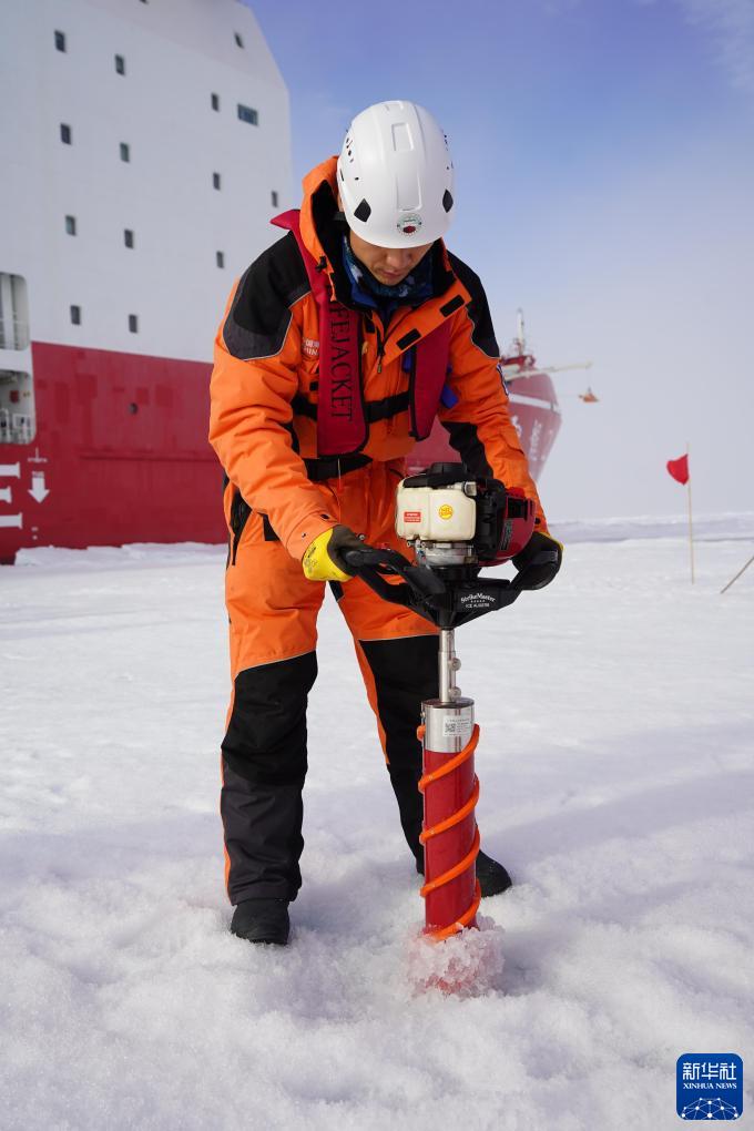 北京時(shí)間凌晨5時(shí)左右,“雪龍2”號(hào)搜尋到合適的作業(yè)海冰。經(jīng)先遣科考隊(duì)員探察完冰面安全區(qū)域后,執(zhí)行首站海冰綜合調(diào)查作業(yè)的科考隊(duì)員攜帶科考設(shè)備,沿著舷梯步行下冰。隨后,科考隊(duì)員分別進(jìn)行了海冰物質(zhì)平衡浮標(biāo)布放、海冰冰芯采集、無(wú)人機(jī)海冰光學(xué)觀測(cè)等9項(xiàng)作業(yè)。整個(gè)過程持續(xù)約5小時(shí)。