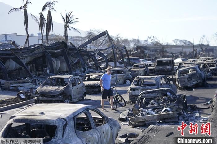 當(dāng)?shù)貢r(shí)間8月8日,夏威夷群島第二大島毛伊島爆發(fā)野火并迅速蔓延,至8月12日已造成89人死亡。圖為一名男子在野火重災(zāi)區(qū)拉海納鎮(zhèn)的廢墟間穿行。