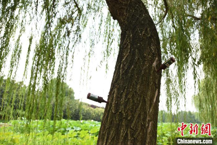 在漯河市黃山路、淞江路、嵩山路、遼河路等多條道路上,記者同樣看到,道路兩旁的高大粗壯的“饅頭柳”“毛白楊”枝繁葉茂,郁郁蔥蔥,許多樹上同樣斜插著三四個(gè)“小藥瓶”。