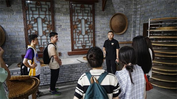 圖為茶村負(fù)責(zé)人向?qū)嵺`團(tuán)成員講解關(guān)于茶葉加工的知識(shí)