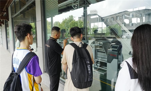 圖為茶村負(fù)責(zé)人向?qū)嵺`團(tuán)介紹信陽毛尖的現(xiàn)代化加工設(shè)備