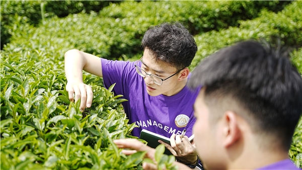 圖為實(shí)踐團(tuán)成員與茶園負(fù)責(zé)人交流茶葉農(nóng)業(yè)技術(shù)和科學(xué)養(yǎng)護(hù)方法