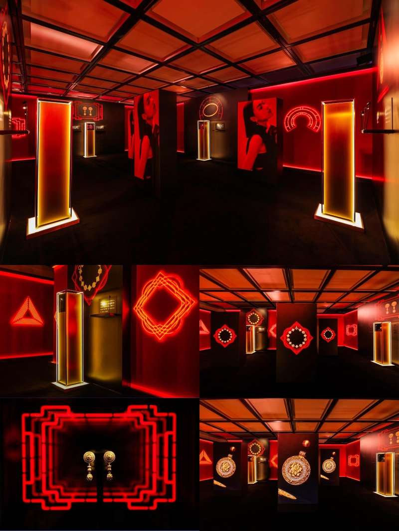 博大精深的中國傳統(tǒng)文化孕育出無限創(chuàng)造力和想象力,因此周大福珠寶集團(tuán)在探索珠寶美學(xué)與中國傳統(tǒng)文化相結(jié)合的過程中不斷推陳出新,呈獻(xiàn)許多匠心獨(dú)運(yùn)的藝術(shù)臻品——標(biāo)志性的周大福傳承系列作品。此次GOLD IS CHIC鎏光時(shí)代·周大福傳承系列黃金美學(xué)藝術(shù)展跨越時(shí)空界限,將蘊(yùn)含歷史、文化的黃金美學(xué)呈現(xiàn)到大眾視野中,全方面展現(xiàn)黃金珠寶設(shè)計(jì)背后的時(shí)尚創(chuàng)意靈感、精益求精的工藝和具有東方韻味的藝術(shù)美學(xué)理念。此次展覽的空間設(shè)計(jì)從周大福傳承系列視覺大片中汲取靈感,衍生出紅黑金三色、光影不斷變換、又極富想象力的三個(gè)空間,以創(chuàng)新的藝術(shù)視角展現(xiàn)品牌具有中國傳統(tǒng)文化內(nèi)涵的時(shí)尚潮流形象。置身于展覽空間,映入眼簾的是霓虹線條與迷離燈光相互交織而成的“時(shí)光隧道”,使人仿佛置身于過去與未來的交界地。光影流動(dòng)的變幻間,映照出品牌歷經(jīng)歲月沉淀后的璀璨輝煌,這意味著品牌正開啟黃金世代的嶄新篇章。