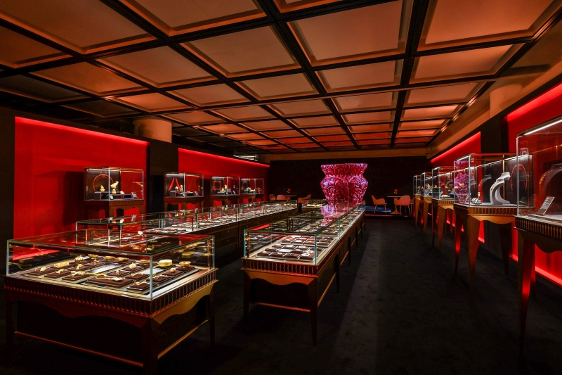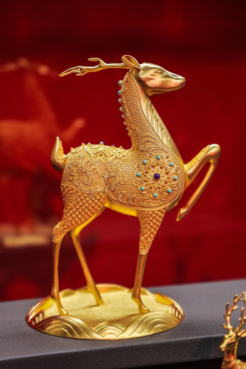 其中,盛世華彩·傳承系列的唐馬套系,以現(xiàn)藏于陜西歷史博物館的唐三彩馬三花馬為原型,采用傳統(tǒng)黃金鑄造、花絲、 鏨刻魚子地等工藝的基礎(chǔ)上,加之藝術(shù)加工與文化創(chuàng)意,再現(xiàn)大唐盛世開放融合的生活之態(tài);從古至今,葫蘆文化有著數(shù)千年的歷史積淀,以其獨(dú)特的歷史淵源在現(xiàn)代文化中占據(jù)重要地位,是中華吉祥文化的代表象征。展柜中陳列著各式各樣的葫蘆作品,不僅僅造型上精心雕琢、美輪美奐,工藝上采用黃金花絲、琺瑯、鏨刻等多重工藝表達(dá)傳統(tǒng)文化的美,也將富貴長壽、福祿雙全的吉祥祝福寄托于物;“洛陽親友如相問,一片冰心在玉壺”,品牌借由國玉·傳承系列的玉承萬代和田玉茶具表達(dá)出牽絆著遠(yuǎn)行人的心緒,將品牌對生活美學(xué)的研究和融入發(fā)揮至極致。