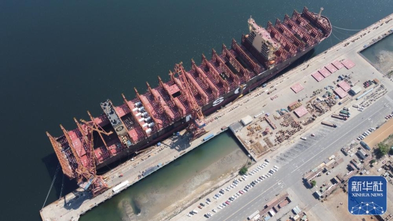 這是6月21日在中船(天津)船舶制造有限公司廠區(qū)拍攝的一艘已經(jīng)下水準備交付的船舶(無人機照片)。新華社記者 趙子碩 攝