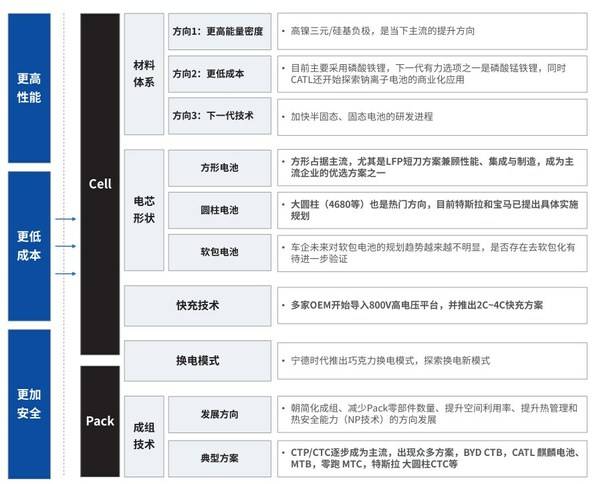 材料從根本上決定著電池性能。通過改進(jìn)材料提高電池性能、優(yōu)化電池老化機(jī)制、應(yīng)用新型材料、改變電芯結(jié)構(gòu)是電芯研發(fā)的主要方向。例如,材料體系方面,采用新型材料體系(高鎳正極、硅基負(fù)極、鋰金屬負(fù)極、固態(tài)電解質(zhì)等),提高單體能量密度;或者研制出磷酸錳鐵鋰,探索鈉離子電池的商業(yè)化應(yīng)用,降低成本;或者加快固態(tài)電池的研發(fā)進(jìn)程,使電池性能更高,更耐久。電芯形狀方面,方形電池,尤其是LFP短刀兼顧性能、集成與制造,成為主流企業(yè)的優(yōu)選方案之一;大圓柱電池也是熱門方向,特斯拉和寶馬均已提出具體的實(shí)施規(guī)劃??斐浼夹g(shù)方面,多家主機(jī)廠開始導(dǎo)入800V高電壓平臺,并聯(lián)合電池企業(yè)推出2C~4C快充方案。
