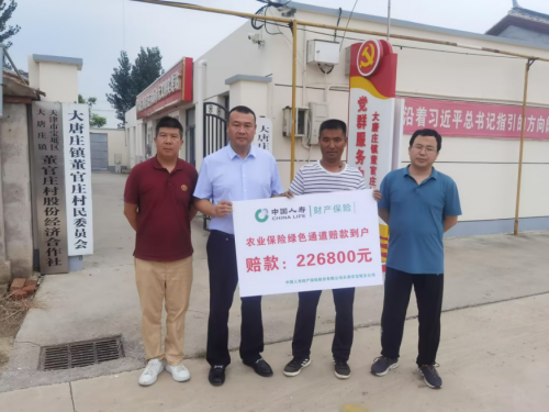 在天津市寶坻區(qū),受連日暴雨影響,當(dāng)?shù)厮敬竺娣e被淹,農(nóng)戶損失巨大,國壽財(cái)險(xiǎn)天津市分公司成立了大災(zāi)應(yīng)急查勘小組,開通農(nóng)險(xiǎn)綠色理賠服務(wù)通道,為當(dāng)?shù)卮筇魄f鎮(zhèn)狼爾窩村、董官莊村出險(xiǎn)農(nóng)戶提供高效的理賠服務(wù),第一時(shí)間支付賠款合計(jì)約38萬元,給受災(zāi)農(nóng)戶吃了一顆定心丸?!氨┯陝偼#碣r人員就過來了,報(bào)案還不到24小時(shí),20多萬賠款就到賬了,中國人壽的理賠服務(wù)真是太給力了!”收到保險(xiǎn)賠款的種植戶馬先生難掩激動(dòng)之情。