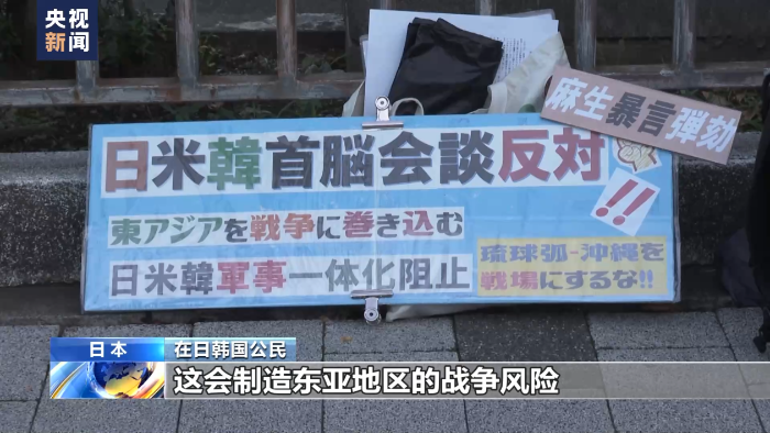17日晚,部分日本民眾和在日韓國(guó)民眾來(lái)到日本首相官邸前,高聲抗議美日韓三國(guó)領(lǐng)導(dǎo)人會(huì)談??棺h民眾表示,美日韓三國(guó)近期不斷在東亞地區(qū)加強(qiáng)軍事力量,頻繁舉行聯(lián)合軍演,制造緊張局勢(shì),而如此在東亞地區(qū)制造不安因素,只符合美國(guó)的戰(zhàn)略利益。